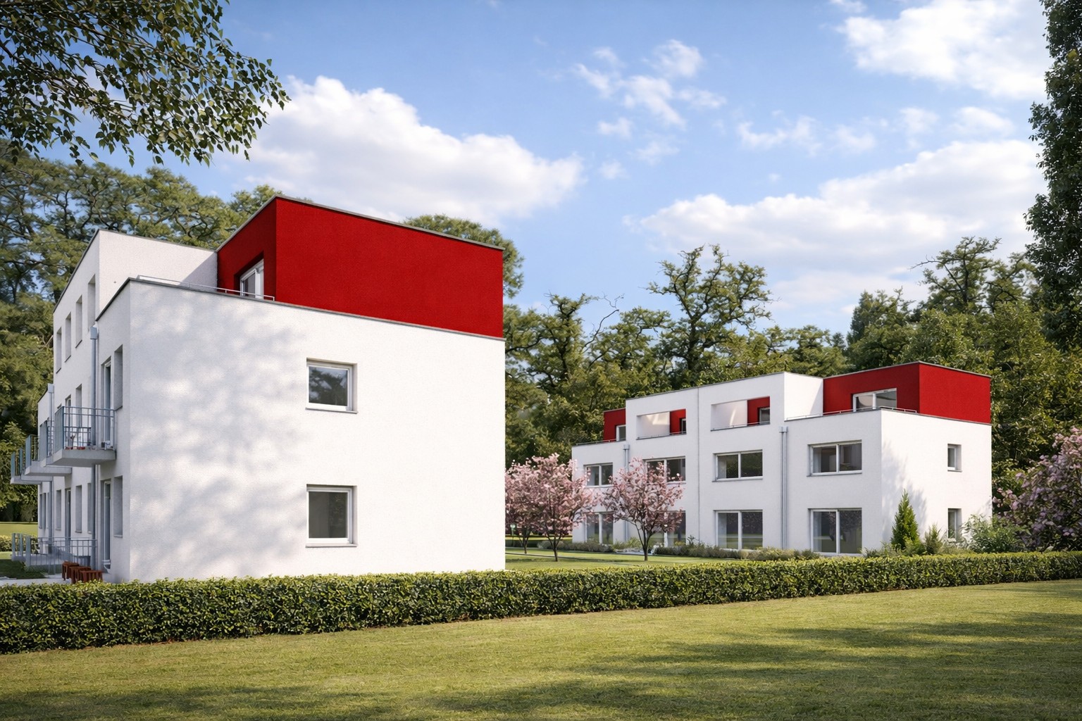 Entstanden ist eine Wohnanlage, die sich selbstverständlich in die Maßstäblichkeit und Struktur der umgebenden Bebauung einfügt und zugleich eine präzise, zeitgemäße Architektursprache formuliert. Die Häuser wurden mit zwei Vollgeschossen und einem zurückgestaffelten obersten Geschoss konzipiert. So entstanden kompakte, effizient organisierte Wohneinheiten mit hoher Alltagstauglichkeit und differenzierten privaten Freiräumen.