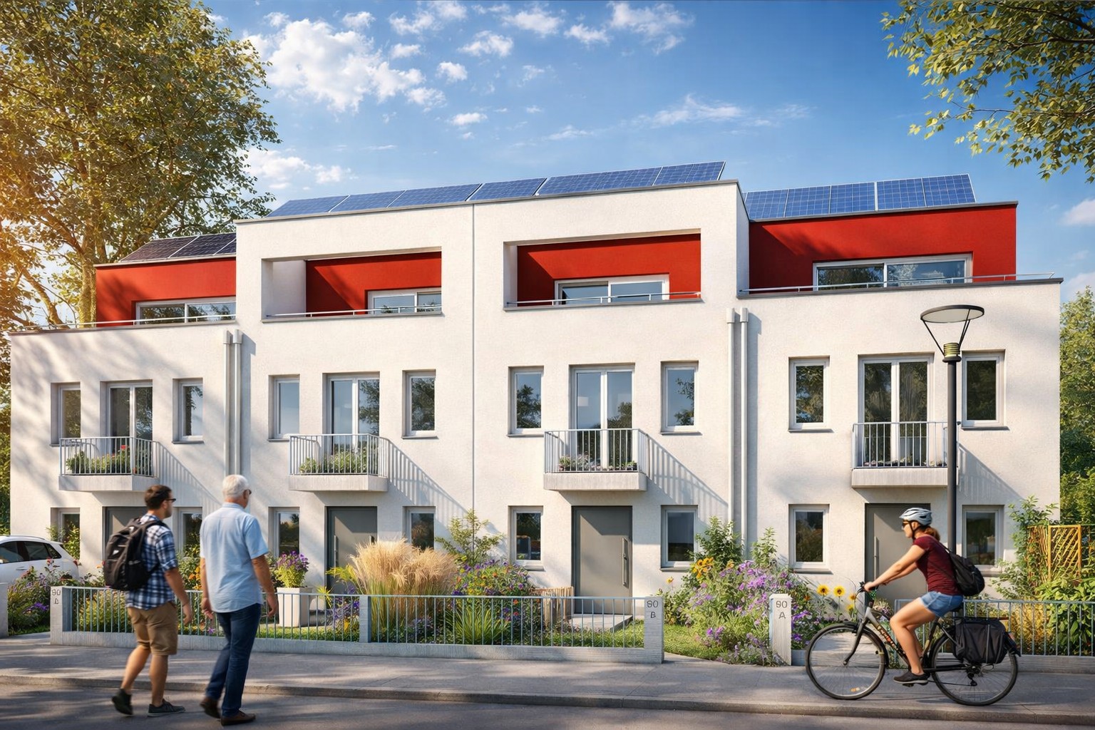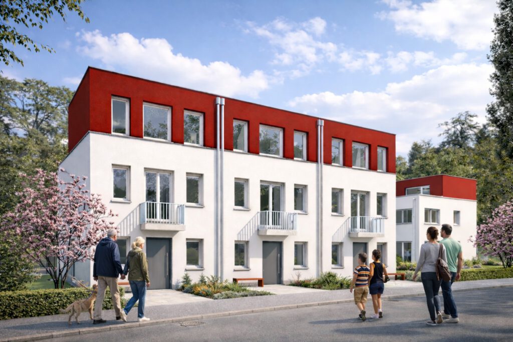 Auch konstruktiv folgt das Projekt einem robusten und langlebigen Ansatz. Die Häuser wurden in Massivbauweise errichtet, mit tragenden Bauteilen aus Mauerwerk und Stahlbeton sowie klar voneinander getrennten Einheiten. Dreifach verglaste Fenster, extensive Dachbegrünung und eine zeitgemäße technische Gebäudeausstattung mit Luft-Wasser-Wärmepumpen unterstreichen den Anspruch, wirtschaftliches Bauen mit nachhaltigen Qualitäten zu verbinden.