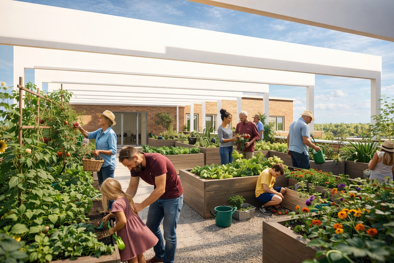 Begegnung über dem Alltag: Dachgärten bieten Rückzug und Gemeinschaft zugleich – mit Zonen für Ruhe, gemeinsames Gärtnern, kleine Anlässe oder informelle Treffen.