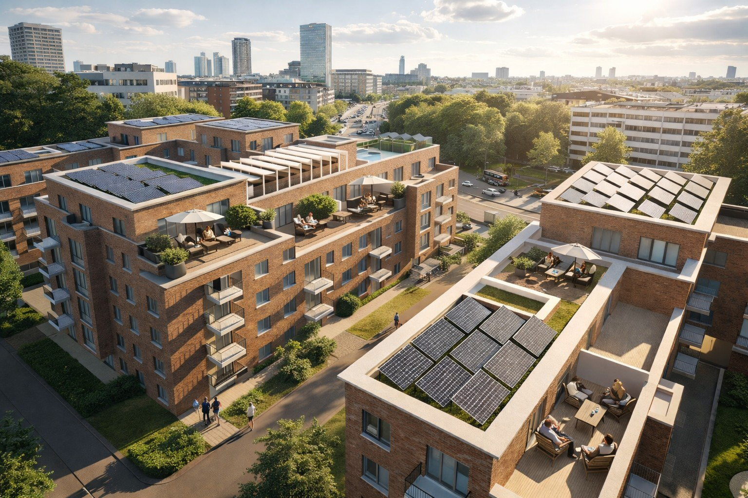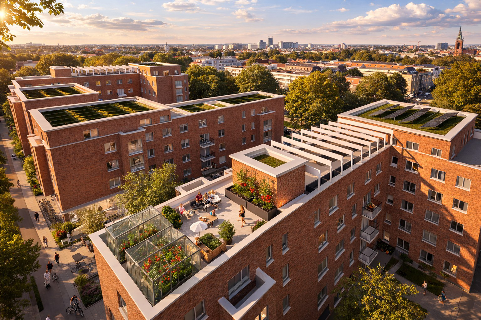 Hohe Wohnqualität für alle: Nicht jede Wohnung braucht eine große private Außenfläche, wenn es hochwertige Gemeinschaftsdächer gibt. So wird Qualität fair verteilt.
