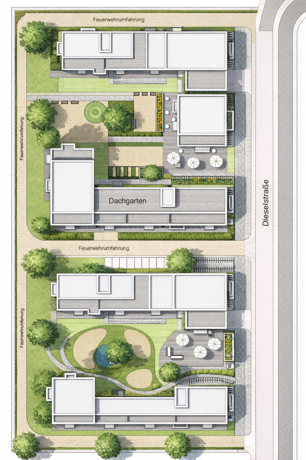 Die Dachgärten sind so gedacht, dass sie robust und pflegearm funktionieren: klare Wege, langlebige Beläge, standortgerechte Bepflanzung und sinnvolle Zonierung statt empfindlicher Sondergärten.