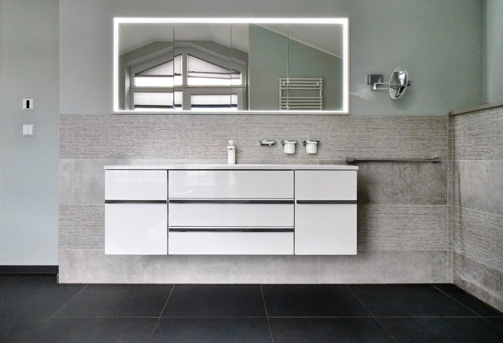 Ein zentrales Entwurfsthema ist die Belichtung und räumliche Weite trotz schmaler Grundfläche. Das wird durch gezielt gesetzte Öffnungen, unterschiedliche Raumhöhen, die Galerie sowie einen eingeschnittenen Außenraum im Untergeschoss erreicht. Dieser Atriumbereich bringt Tageslicht tief in das Haus hinein und wertet besonders das Souterrain entscheidend auf. Im Entwurf war hier zusätzlich ein Wellness- beziehungsweise Schwimmbadbereich vorgesehen, der das Raumprogramm der fünfköpfigen Familie ergänzte. Damit wird deutlich, wie intensiv das Grundstück räumlich genutzt und zugleich qualitativ aufgeladen wurde.