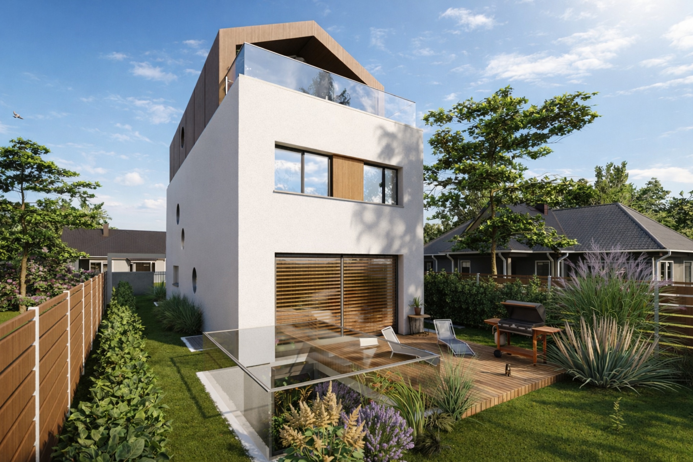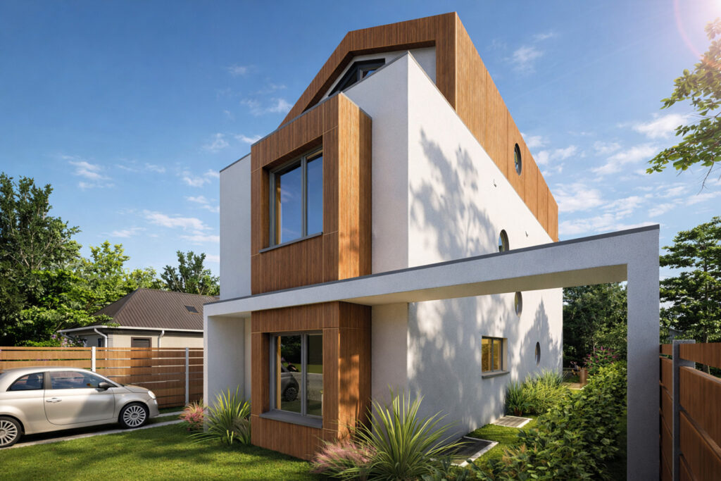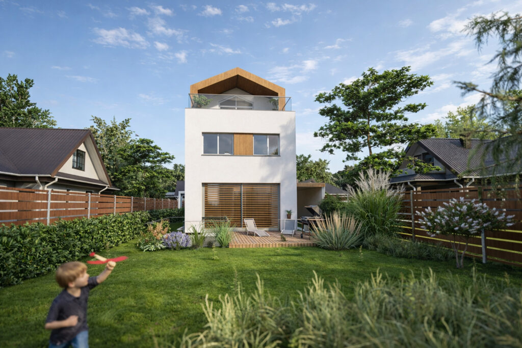 Auf engem Grundstück entstand ein charakterstarkes Familienhaus, das über vier Ebenen Großzügigkeit, Tageslicht und klare räumliche Ordnung zu einer eigenständigen architektonischen Lösung verbindet.