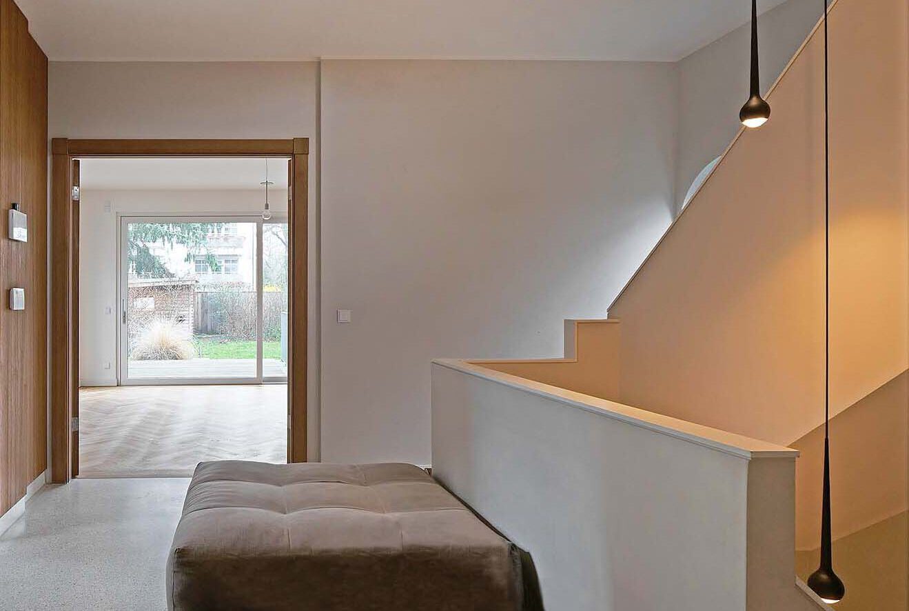 Auf engem Grundstück entstand ein charakterstarkes Familienhaus, das über vier Ebenen Großzügigkeit, Tageslicht und klare räumliche Ordnung zu einer eigenständigen architektonischen Lösung verbindet.