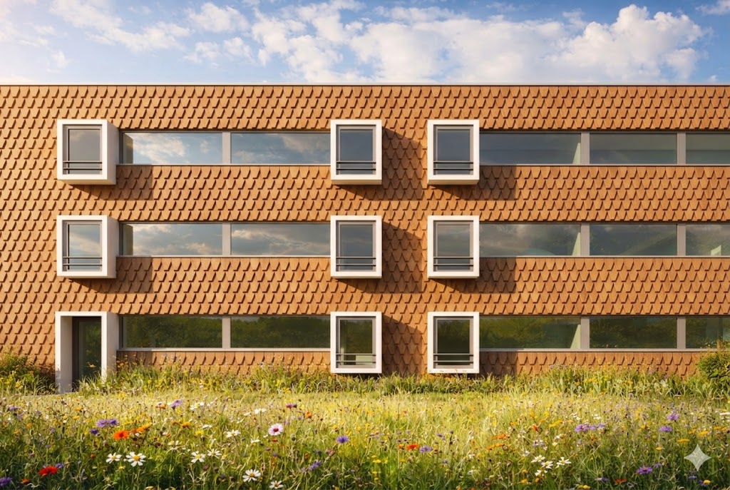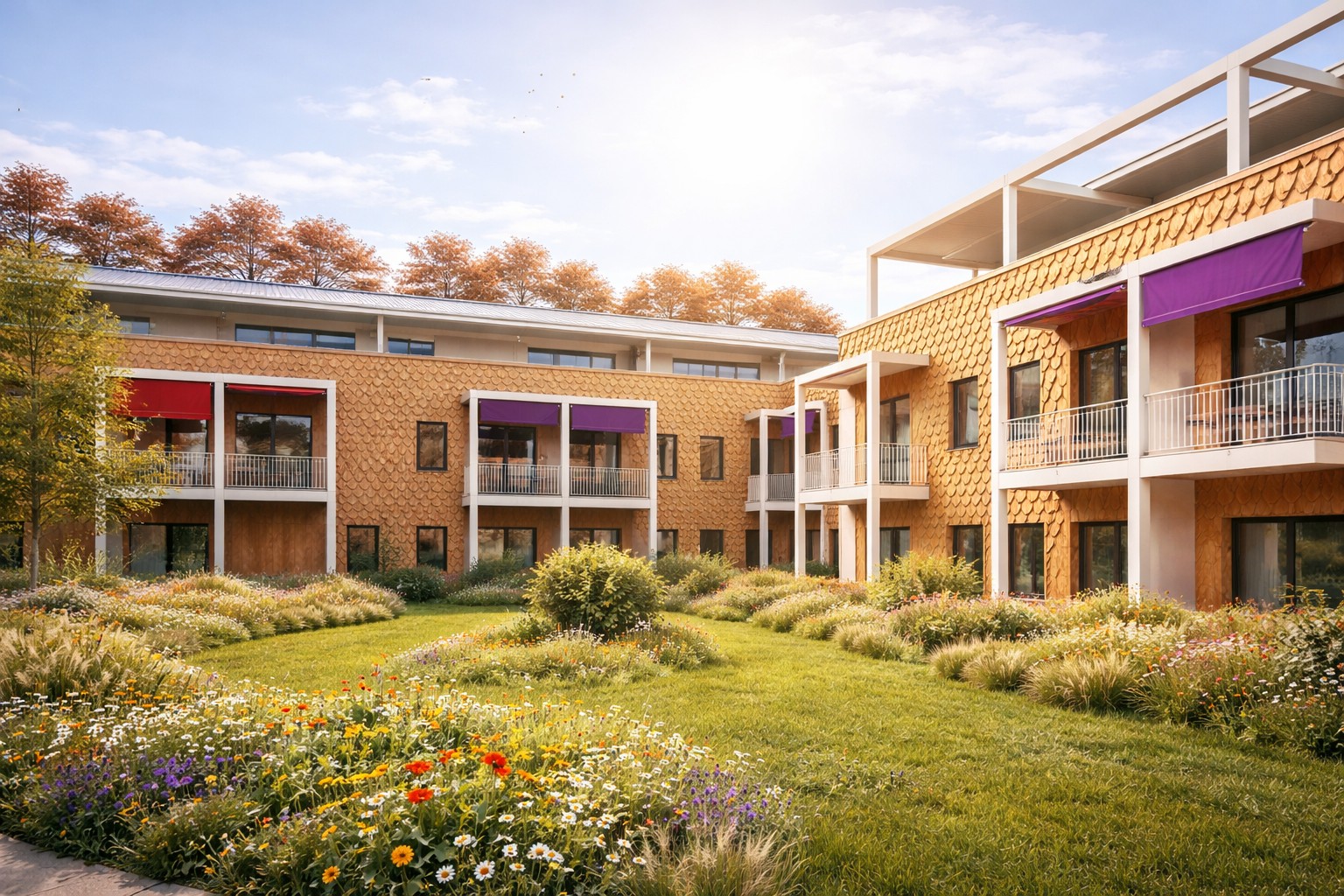 Die markante Zickzackform erzeugt fünf geschützte Höfe als grüne Wohninseln mit unterschiedlichen Schwerpunkten – von Begegnung und Aktivität bis Rückzug. So entsteht ein Inklusionswohnen, das Gemeinschaft ermöglicht, ohne Privatheit zu verlieren. Alle Apartments erhalten einen privaten Außenraum (großer Balkon oder Terrasse) und profitieren von einer Gebäudestruktur, die die Wohneinheiten überwiegend nach Süden, Osten und Westen ausrichtet. Die Erschließung ist als helle, natürlich belichtete Kommunikationszone gedacht: Flure erschließen nur punktuell beidseitig und bleiben dadurch freundlich und übersichtlich.