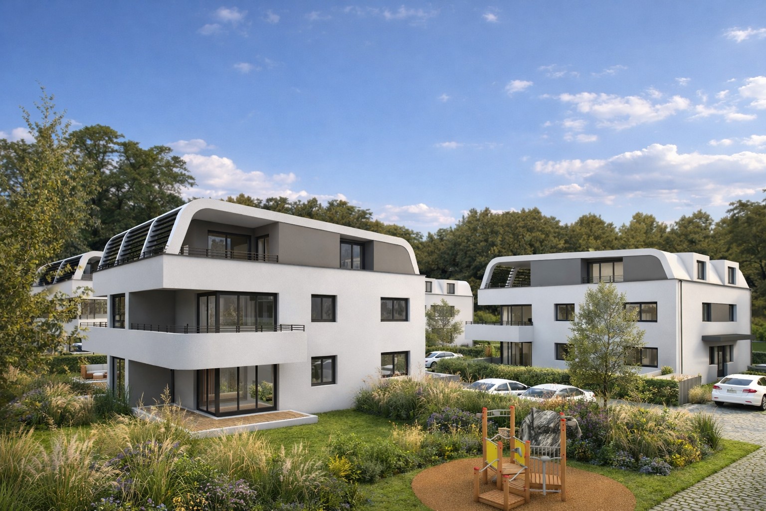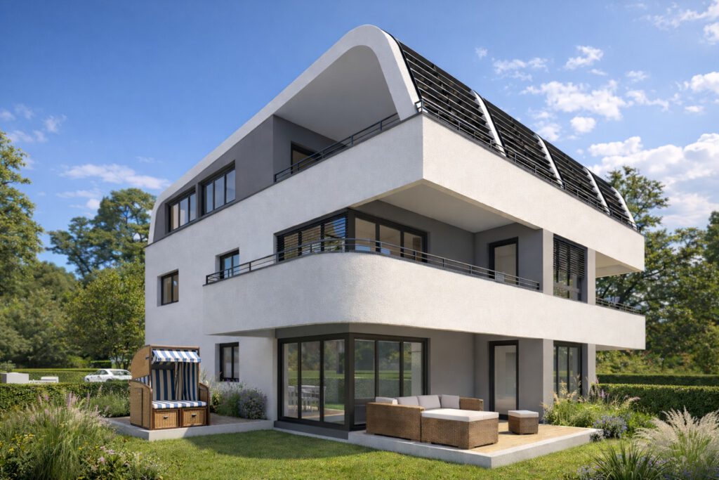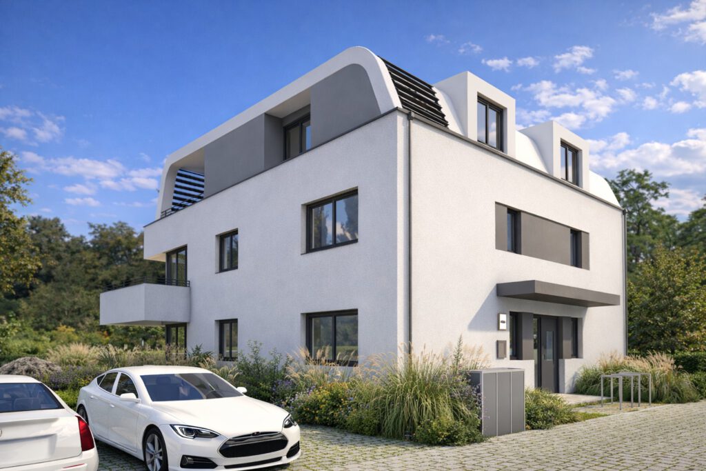 Besonderes Gewicht liegt auf der Verbindung von Architektur, Freiraum und Energie. Der Erlebnisraum Natur soll das Wohngebiet in mehreren Ebenen durchdringen; intensive Gründächer, minimierte Versiegelung, unterirdisch organisierte Nebenanlagen und ein sensibler Umgang mit Regenwasser stärken die ökologische Qualität des Standorts. Ergänzt durch Smart-Living, Ladeinfrastruktur für E-Mobilität und ein mit lokalen Versorgern gedachtes Energiekonzept entsteht ein Quartier mit hoher energetischer Eigenversorgung und klarer Zukunftsorientierung.