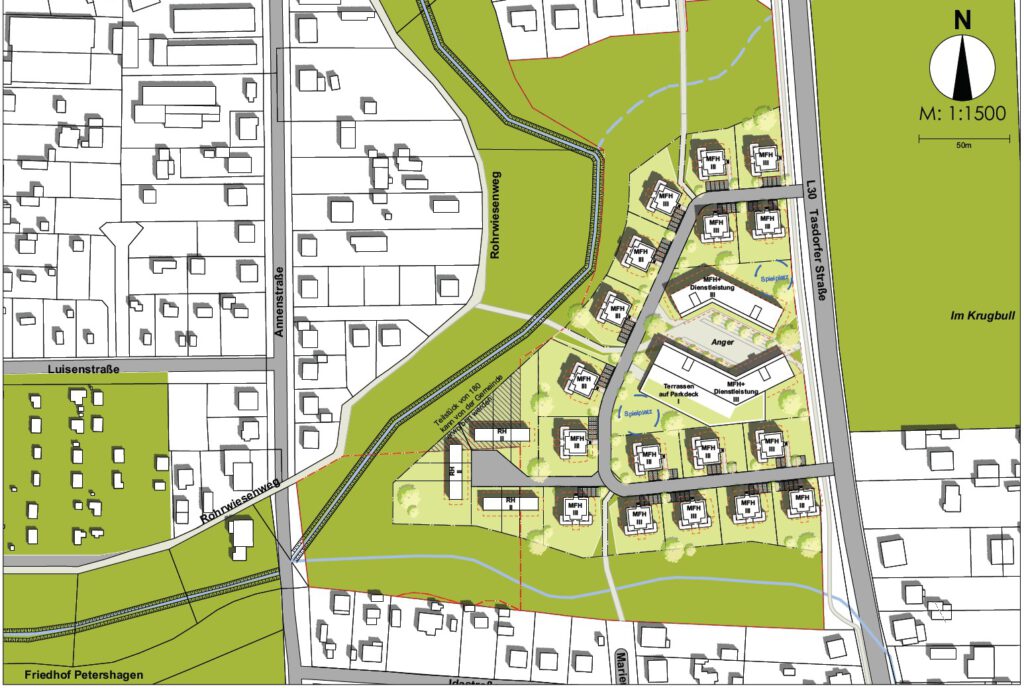 Mit „Anger an der Laakenwiese“ entwickelt Büro13 Architekten ein generationenübergreifendes Wohnquartier, das Servicewohnen, Mehrgenerationenwohnen und Familienwohnen in einer gemeinsamen, landschaftlich geprägten Struktur verbindet. Ein zentraler Anger als Quartiersmitte, barrierefreie Wohnangebote, Gründächer, Passivhausstandard und ein regenerativ gedachtes Energiekonzept schaffen ein zukunftsorientiertes Wohnumfeld mit hoher Aufenthaltsqualität. So entsteht ein nachhaltiges Quartier, das soziale Nähe, ökologische Verantwortung und architektonische Klarheit zu einem identitätsstiftenden Ganzen zusammenführt.