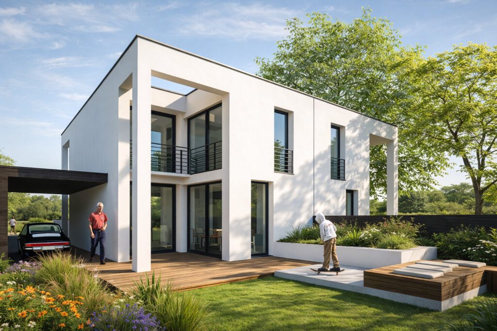 Die Architektur folgt einem ruhigen, einheitlichen Gestaltungskanon. Klare kubische Baukörper, präzise gesetzte Öffnungen und eine zurückhaltende Fassadensprache verleihen dem Quartier seine zeitlose Identität. Ergänzt wird der Entwurf durch ein ganzheitliches Energiekonzept mit Passivhausstandard, passiver Solarenergienutzung, Lüftung mit Wärmerückgewinnung, Fernwärmeanschluss und optionaler Photovoltaik. So verbindet die Studie die Nachnutzung einer Infrastrukturbrache mit architektonischer Klarheit, ökologischer Substanz und einem starken Bild von gemeinschaftlichem Wohnen.