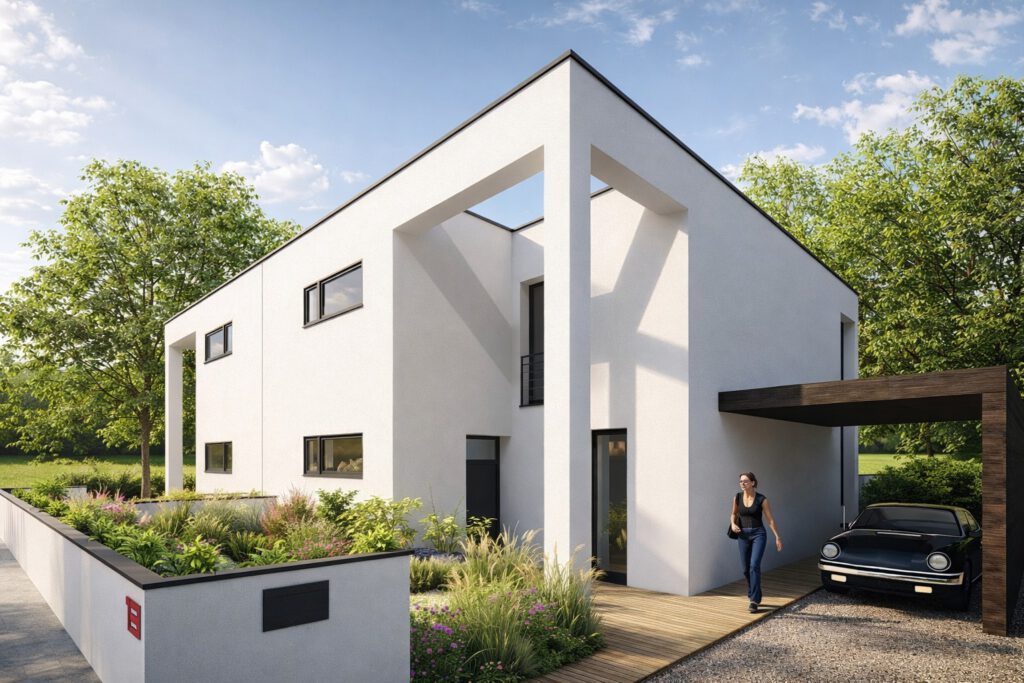 Für die beengten Grundstückszuschnitte wurde eigens ein Gebäudetypus entwickelt, der auf räumliche Qualität statt auf Größe setzt. Eingeschnittene Atrien verzahnen Wohnraum und Garten, schaffen geschützte Außenräume und ermöglichen ein Höchstmaß an Privatheit trotz der baulichen Enge. So entstehen Häuser, die Offenheit und Rückzug in ein präzise austariertes Verhältnis setzen.